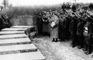 During the First Battle of Ypres (1914) in World War I, inexperienced German infantry suffered severe casualties when they made a futile frontal attack on allied positions near Langemark and were checked by experienced French infantry and British riflemen. Contrary to popular myth, only fifteen percent of the German soldiers involved in the Battle of Langemark were schoolboys and students. Legend has it that the German infantry sang the first stanza of what later (1919) became their national anthem “Deutschland, Deutschland über alles“, as they charged.